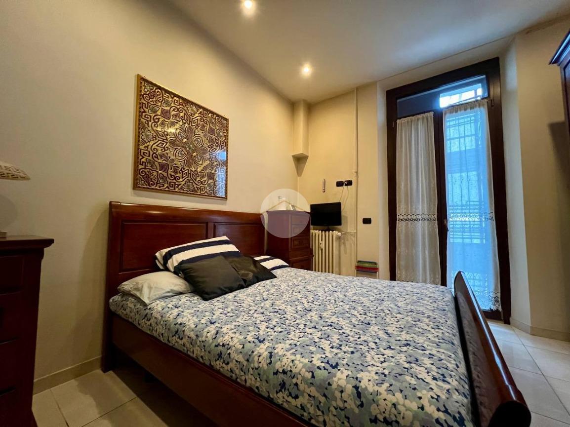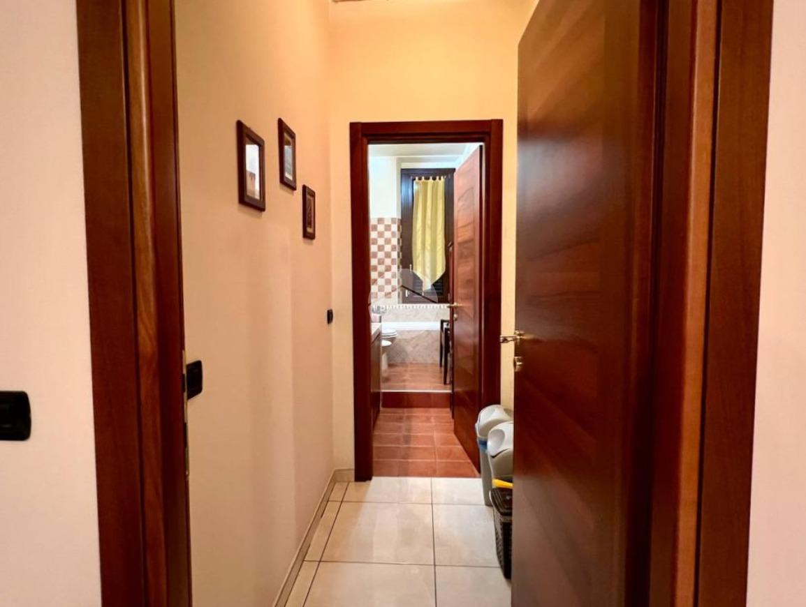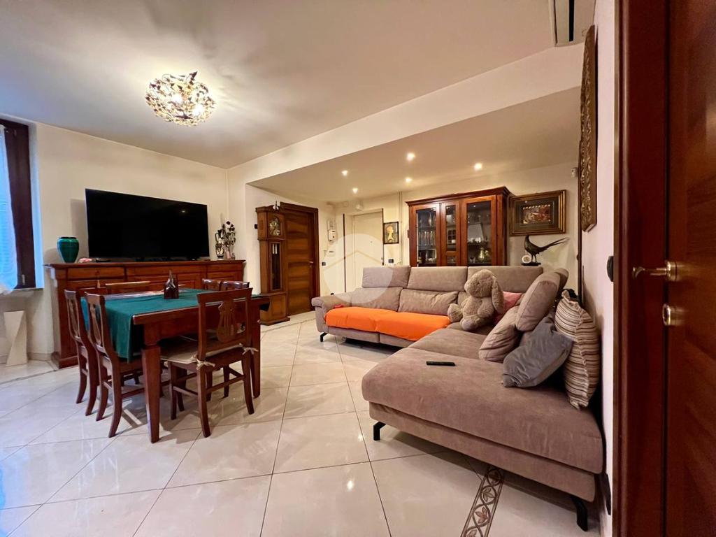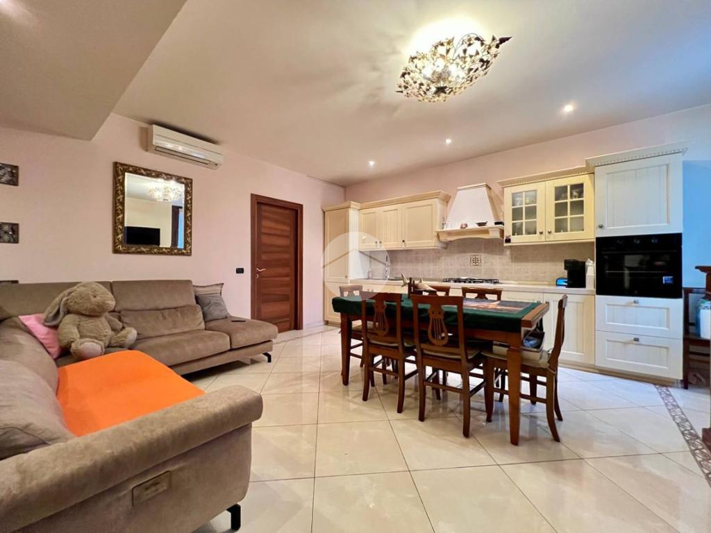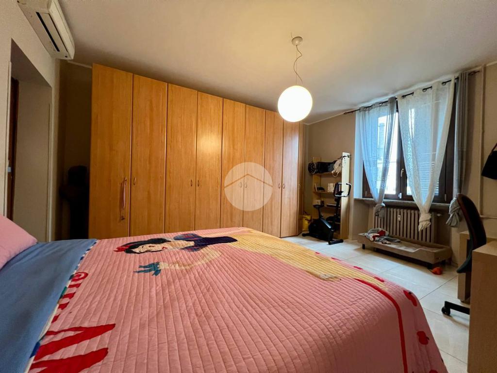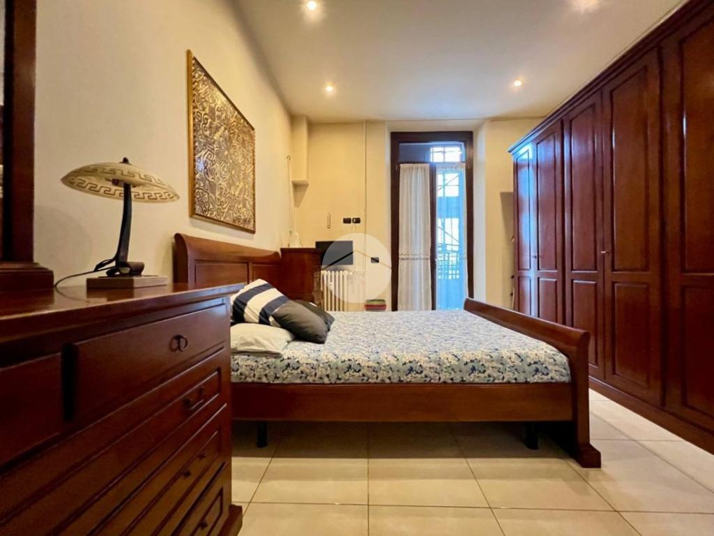 L’appartamento è composto da ingresso su ampio soggiorno con cucina a vista, due camere matrimoniali di cui una dotata di bagno privato e balcone che affaccia all’interno del cortile condominiale, antibagno e bagno finestrato. Completa la proprietà una cantina di pertinenza.